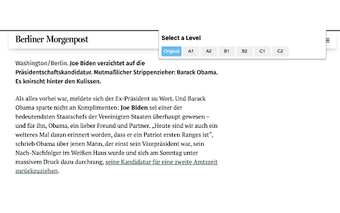 Niveau เป็นส่วนขยายของ Chrome ที่ออกแบบมาเพื่ออำนวยความสะดวกในการเรียนรู้ภาษาโดยการแปลเนื้อหาของเว็บเพจให้ตรงกับระดับความสามารถทางภาษาของผู้ใช้ เครื่องมือนี้ช่วยให้ผู้เรียนสามารถโต้ตอบกับเนื้อหาออนไลน์ในลักษณะที่สอดคล้องกับความเข้าใจของพวกเขา ทำให้ประสบการณ์นี้ทั้งการศึกษาและสนุกสนาน ผู้ใช้สามารถปรับการแปลให้เหมาะสมกับระดับ CEFR ใดก็ได้ตั้งแต่ A1 ถึง C2 เพื่อให้แน่ใจว่าวัสดุยังคงเข้าถึงได้และเกี่ยวข้องกับทักษะปัจจุบันของพวกเขา